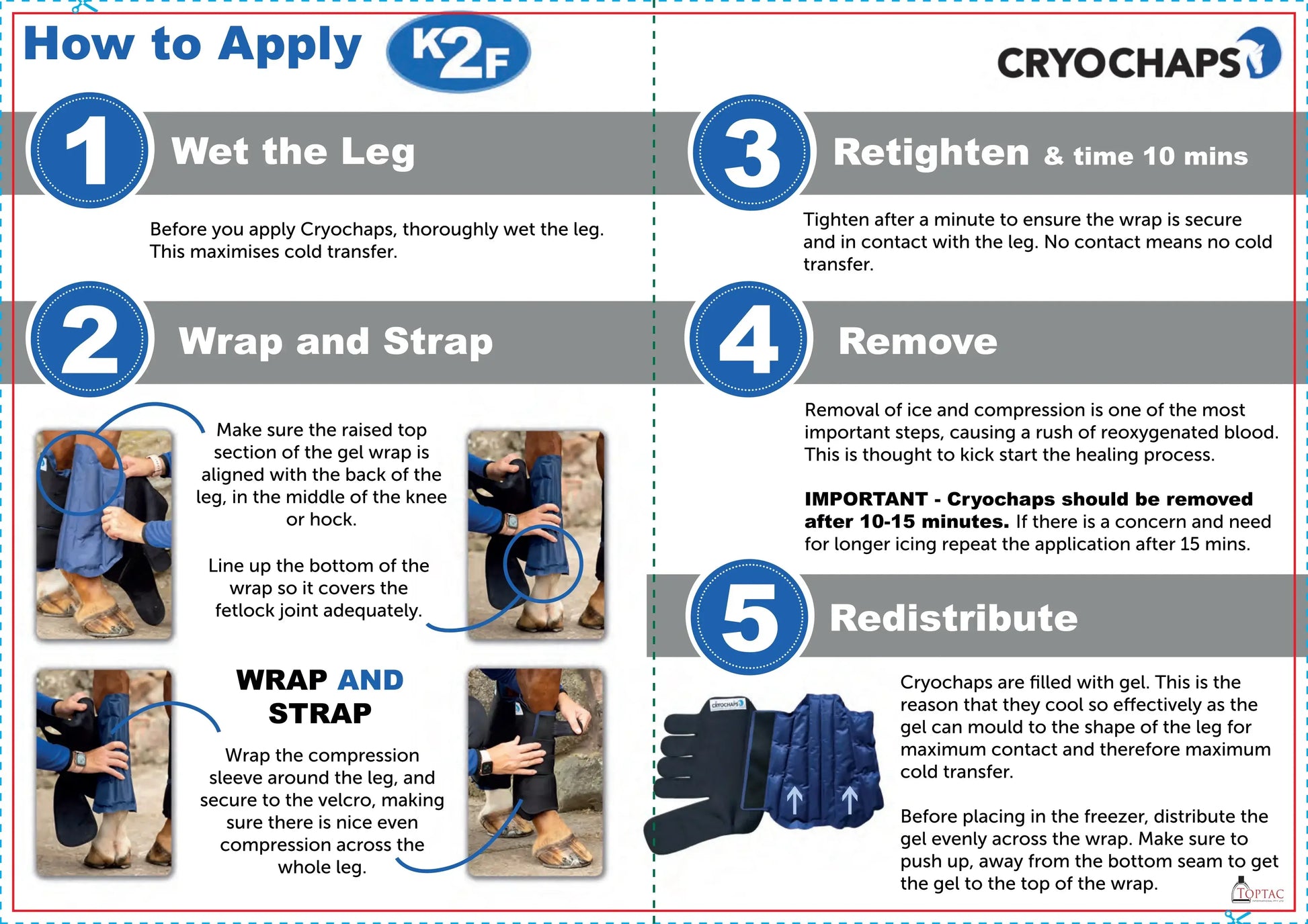 Cryochaps K2F cooling wraps for horses have been designed with a focus on post-exercise recovery and injury prevention. They have been developed to mimic ice bath therapy. The general theory behind cold therapy is that the cold exposure helps to combat the micro trauma (small tears) in tissues and resultant soreness caused by intense or repetitive exercise.