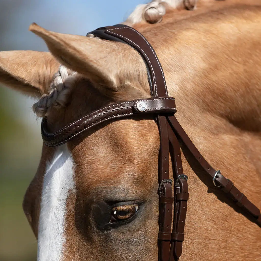 Designed for those who love classic class, the bridle is handcrafted from quality leather and features a plaited flat browband with an elegant modest curve. The browband is an easy-change browband, with a stunning silver satin finish button.